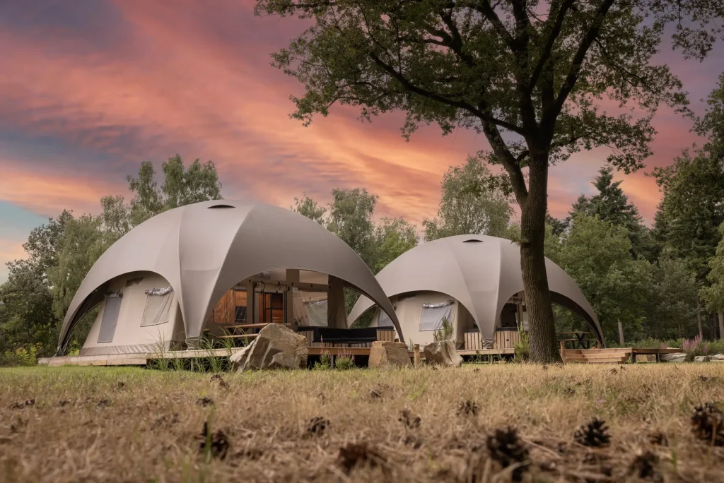 - Luxury glamping with pools in the UK means boutique sites (Loveland Farm Devon, The Pennard Hide Somerset, Uppergate Farm Yorkshire) with small eco-pools or indoor heated pools shared between a handful of units — intimate, chemical-free or low-chemical, typically from £120–300/night for a geodome or treehouse.